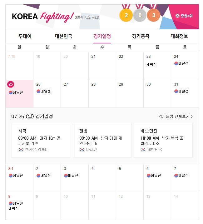 도쿄올림픽의 공식사이트(https://olympics.com/ko/)는 따로 있으나 가독성면에서 불편한 부분이 많습니다. 저는 개인적으로 익숙한 다음 스포츠(Daum sports)를 참고하시는 것을 추천 드립니다.
