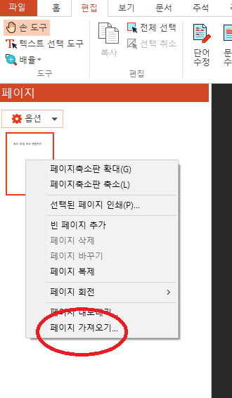 반대로 여러장의 PDF 파일 중 한 장만 따로 빼고 싶을 때는 [페이지 내보내기]를 이용하시면 됩니다.