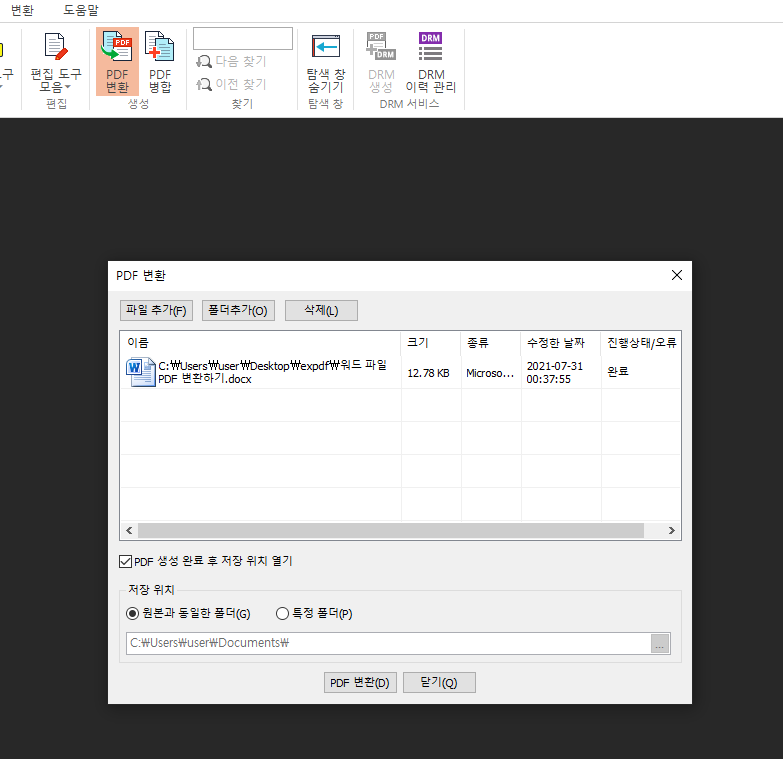 메뉴 중 [PDF 변환]을 클릭 한 뒤, 변환 하고자 하는 문서를 불러옵니다. 그리고 확인을 누르면 아래와 같이 같은 폴더에 워드와 PDF 파일이 나란히 저장되어 있는 것을 확인 하실 수 있습니다.