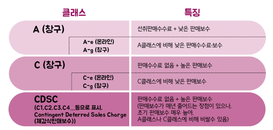 펀드는 가입자격 및 판매경로에 따라 종류(클래스)별로 판매수수료와 보수가 다르게 부과됩니다. 그래서 본인의 투자목적 및 추자기간(장기, 단기)에 따라 적당한 클래스를 선택하는 것이 중요합니다.