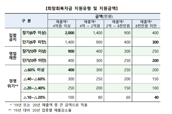 2020년 8월 16일부터 2021년 7월 6일까지 기간 중 집합금지 조치를 이행한 사업체는 매출규모에 따라 최소 300 ~ 최대 2,000만원을 지원 받을 수 있습니다.