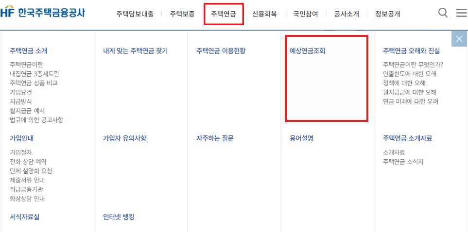 한국주택금융공사 홈페이지에 접속하여 상단 주택연금 메뉴를 선택하면 예상연금조회 메뉴를 선택할 수 있습니다.