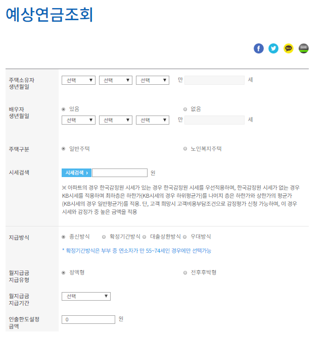 이곳에서 지급 방식과 지급유형 및 생년월일, 시세를 입력하면 간편하게 주택연금수령액 계산 결과를 확인해보실 수 있습니다. 시세는 해당 페이지에서 시세 검색을 이용하여 바로 검색한 후 입력이 가능합니다.