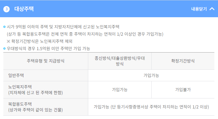 - 다주택자여도 합산가격이 9억원 이하인 경우 문제없으나 만약 9억원을 초과하는 다주택자는 3년 이내에 1주택을 팔아 9억원 아래로 가액을 맞추면 가입 할 수 있습니다.