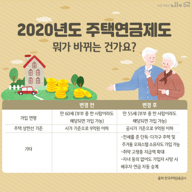 가입 가능 연령은 만 60세 이상에서 만 55세 이상으로 내려갑니다. 주택 가격 기준이 되었던 9억 원은 시가 기준이었으나, 공시 가격을 기준으로 변경됩니다.