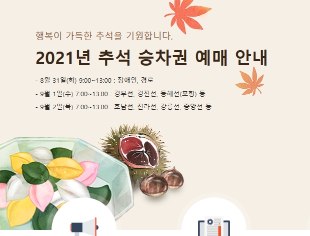 코레일은 8월 31일부터 9월 2일까지 4일간 추석 열차승차권 사전판매를 실시 할 예정입니다. 코로나 19의 여파로 100% 비대면 방식으로 진행되며 예매 대상 열차는 9월 17일~22일 추석 연휴기간 동안 운행되는 KTX, ITX. 새마을 열차입니다.