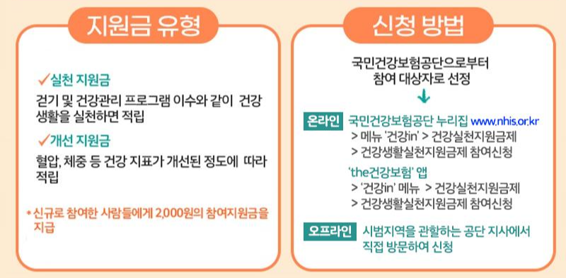 지원금은 실천지원금(건강생활 실천)과 개선지원금(혈압, 체중 등 건강지표 개선) 2가지로 나뉘고 신청은 국민건강보험공단을 통해 온/오프라인으로 할 수 있습니다.