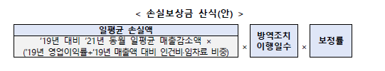 1. 일 평균 손실액 : 19년 대비 21년 동월 일평균 매출감소액에 19년 영업이익률과 매출액 대비 인건비/임차료 비중의 합을 곱해서 산정합니다.