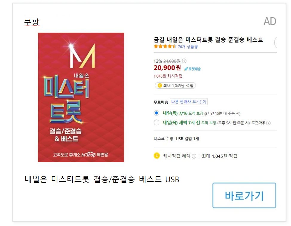저희 부모님은 임영웅과 영탁의 팬이신데요, 두 가수의 무대를 실제로 보고 좋아하실 부모님을 생각하면 제 기분이 더 좋아지네요. 차량 또는 PC로 내일은 미스터트롯 결승/준결승 베스트 노래를 듣고 싶으신 분들은 USB를 구매하시면 됩니다.