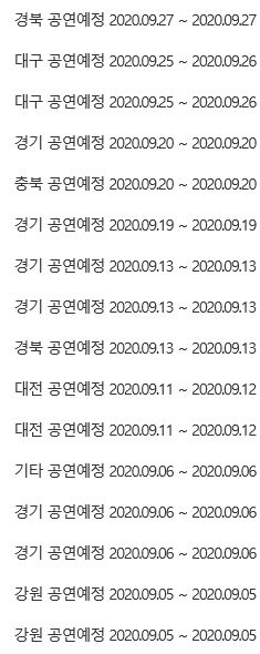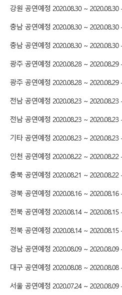 이번 미스터트롯 콘서트는 7월 24일부터 8월 9일까지 진행되는 서울 공연을 시작으로 전주, 창원, 청주, 여수, 광주, 천안, 원주, 부천, 대전, 수원, 의정부, 안산, 대구, 포함, 부산 등 16개 지역에서 10월 초까지 개최 될 예정입니다.