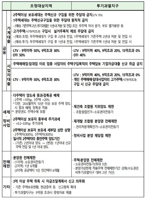조정대상지역의 주택담보대출비율(LTV)은 9억 이하 50%, 9억 초과는 30%입니다. 그런데 투기과열지구에 지정되면 9억 이하 40%, 9억 초과 20%로 대출 한도가 축소됩니다. 아파트 가격이 7억이라고 가정 했을 때 10%면 7천만의 차이이므로 실수요자들이 체감하는 것으로는 결코 적지 않은 차이입니다.