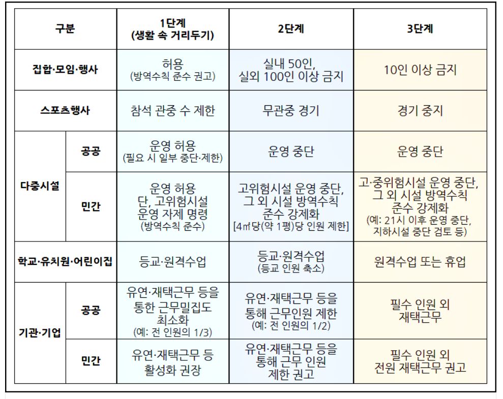 사회적 거리두기 3단계 _ 최고 단계로 필수적 사회활동 제외한 모든 것이 금지 됨