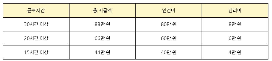 청년을 채용한 중소중견기업에게 6개월간 인건비(월 최대 80만원)과 관리비(인건비의 10%, 월 최대 8만원)를 지원하며 근로시간에 따라 지원금은 다음과 같이 차등 지급됩니다.