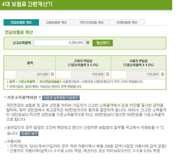 연금보험료, 고용보험료, 국민건강보험, 산재보험료 등 4대 보험은 국민건강보험공단 사이트에서 간편하게 계산 해 볼 수 있습니다.